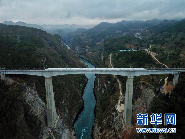 1月25日,渝貴鐵路從貴陽北到重慶西的D8592次首發動車經過遵義市境內的烏江大橋。 當日,設計時速200公里的渝貴鐵路全線開通運營。新華社記者 劉續攝
