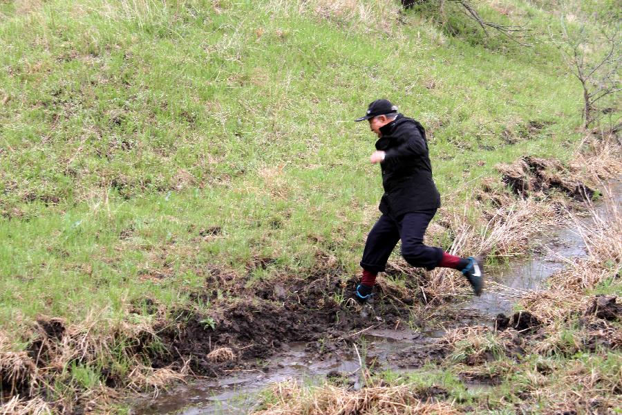 2016年5月25日,王樹清在黑龍江省拜泉縣國(guó)富鎮(zhèn)愛(ài)護(hù)村查看造林地塊時(shí)跳過(guò)一條水溝。新華社發(fā)