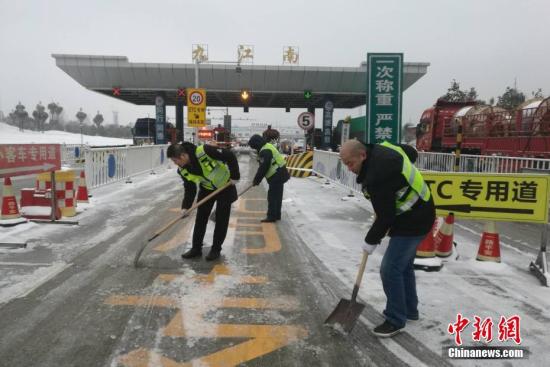 資料圖:江西高速公路工作人員在收費站通道進行掃雪除冰作業。鐘欣 攝