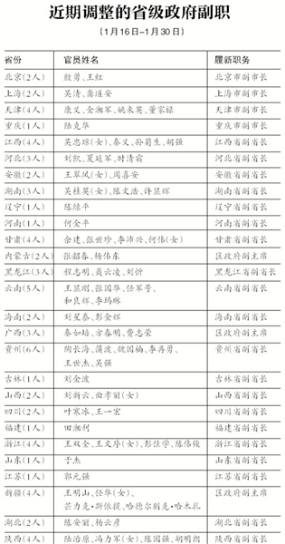 記者注意到,從1月16日開始的省級(jí)政府副職調(diào)整共涉及27省份,1月16日至24日這一批省級(jí)政府副職調(diào)整,共涉及23個(gè)省份,4大直轄市均有調(diào)整。26日至30日,經(jīng)過省級(jí)人大會(huì)議選舉,37位“本土派”副省長(zhǎng)當(dāng)選。