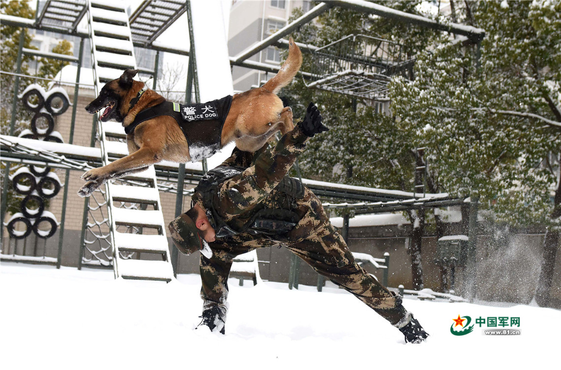 1月27日,武警安徽總隊機動支隊警犬班班長王營廣與警犬“魯克”進行人犬結合訓練。