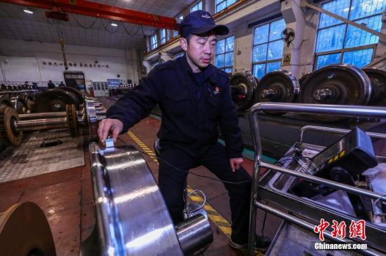 資料圖:列車“修腳師在對列車車輪進行探傷檢查。中新社記者 張暢 攝