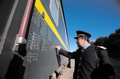 昨日,北京西車務段101站,57歲的值班員趙志剛在臨客車廂上做巡視記錄。記者 朱駿 攝