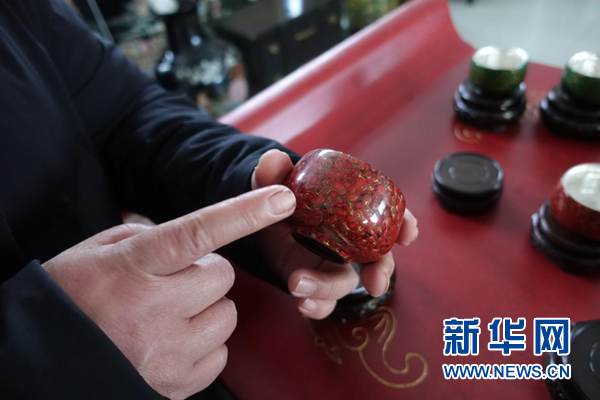 奚建輝介紹“菠蘿漆”技藝制成的茶碗。新華網 卓越 攝