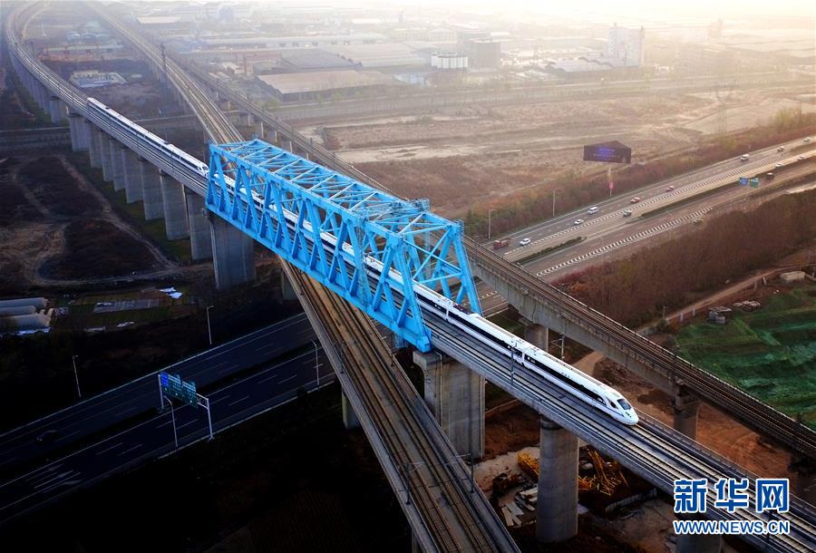 2017年12月6日,西安至成都高速鐵路全線開通運營,由西安北站駛出的列車經(jīng)過西成高鐵跨西寶高鐵特大橋。 新華社記者 劉瀟 攝