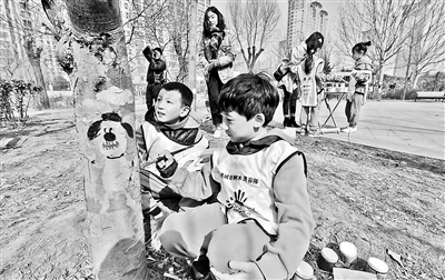 在植樹節即將到來之際,史家小學五年級4班和二年級17班的二十余名同學來到朝陽區泛海國際社區的中心花園,為這里的一棵棵小樹“穿上花衣”。