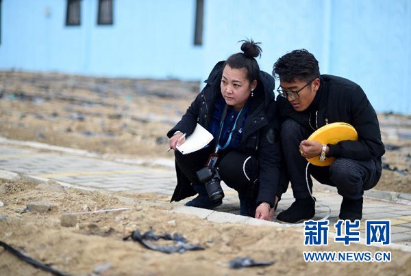 索朗央吉(左)與村干部測(cè)量房前屋后的地,準(zhǔn)備種植玫瑰、牧草等(3月6日攝)。新華社記者 覺果 攝