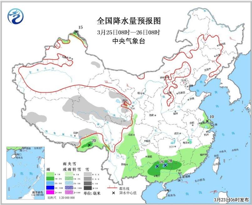 3月24日08時(shí)至25日08時(shí),新疆北部山區(qū)、青海西北部及東南部、川西高原北部等地的部分地區(qū)有小到中雪或雨夾雪,其中新疆北部山區(qū)局地有大到暴雪;新疆沿天山一線、西藏東南部、西南地區(qū)大部、江漢南部、黃淮東部、江淮南部及東部、江南大部、華南中西部等地有小到中雨,其中廣西北部、湖南北部等地的部分地區(qū)有大雨,上述局部地區(qū)并將伴有雷暴大風(fēng)和短時(shí)強(qiáng)降水等強(qiáng)對(duì)流天氣。內(nèi)蒙古中部、東北地區(qū)南部、山東半島等地有4~6級(jí)風(fēng);南疆盆地局地有揚(yáng)沙或浮塵天氣。