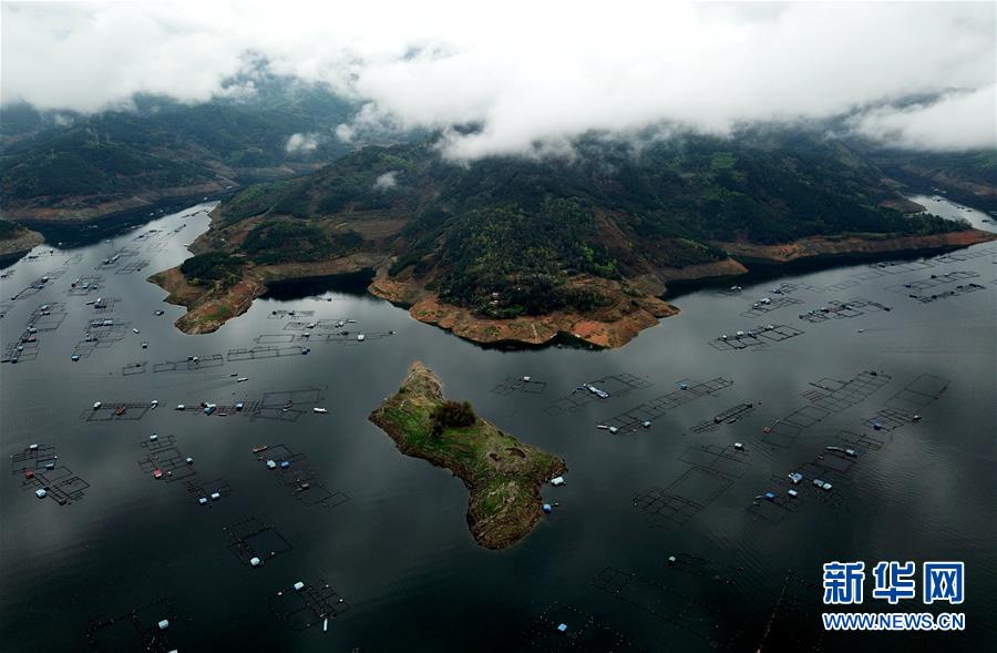 這是無人機拍攝的天生橋庫區紅水河水上“田園”景觀(3月28日攝)。春耕春種時節,在廣西隆林各族自治縣天生橋庫區,當地農民發展的水上養魚場景與紅水河兩岸景色交相融合,構成一幅幅美麗的春日畫卷。新華社記者張愛林攝