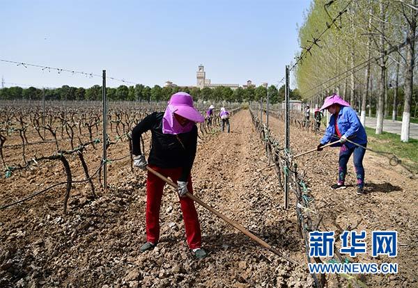 工人在陜西張裕瑞那城堡酒莊的葡萄園內鋤草(3月27日攝)。新華社記者 邵瑞 攝