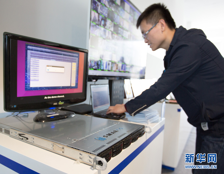 在北京智能計算產(chǎn)業(yè)研究院舉行的發(fā)布會上,工作人員在現(xiàn)場演示高通量人工智能一體機的實際應(yīng)用(2017年12月6日攝)。新華社記者 金立旺 攝