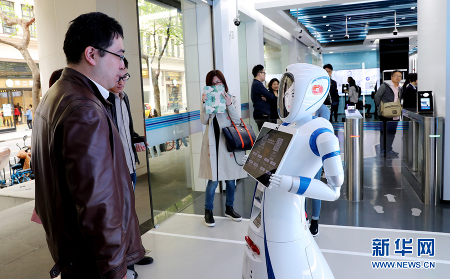 一位市民在位于上海九江路的無人銀行入口處向迎賓機器人說明需要辦理的業(yè)務(wù)種類(4月12日攝)。近日,中國建設(shè)銀行在上海九江路開出國內(nèi)首家無人銀行。新華社記者 方喆 攝