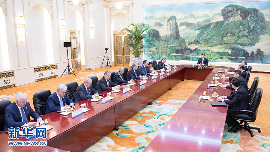 4月23日,國家主席習近平在北京人民大會堂集體會見來華出席上海合作組織成員國外長理事會會議的俄羅斯外長拉夫羅夫、印度外長斯瓦拉杰、哈薩克斯坦外長阿布德拉赫曼諾夫、吉爾吉斯斯坦外長阿布德爾達耶夫、巴基斯坦外長阿西夫、塔吉克斯坦外長阿斯洛夫、烏茲別克斯坦外長卡米洛夫、上海合作組織秘書長阿利莫夫、上海合作組織地區(qū)反恐怖機構執(zhí)委會主任瑟索耶夫。新華社記者 李濤 攝