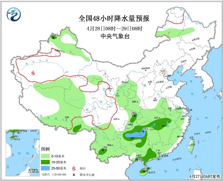 方翀:預計“五一”假期期間,南方地區多降雨天氣。其中,4月28日夜間到29日,貴州、江南等地將有一次降水過程,以中到大雨為主,其中,江南地區東部局地有暴雨。30日白天,上述地區降水略有減弱。但是從30日夜間開始,西南地區東部、江漢、江淮、江南中北部等地,將自西向東先后出現中到大雨,江淮、江漢東部以及江南北部局地將有暴雨。同時,因為大氣不穩定,上述地區將伴有短時強降水和局地的雷暴大風等強對流天氣。