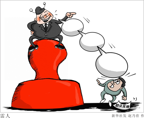 其二,遮丑關(guān)。“家丑不可外揚(yáng)”思維作祟,怕違法亂紀(jì)行為曝光影響地方形象而護(hù)短、包庇。在不少侵害群眾利益的行為中,一些政府部門或多或少充當(dāng)了幫兇。只要群眾忍氣吞聲,這些行為就不了了之。一旦群眾投訴引發(fā)輿論關(guān)注,當(dāng)?shù)卣ε缕毓庥绊懙胤叫蜗笊踔痢盀跫喢薄保团沙龈髀啡笋R“游說”。這些干部接待上訪群眾時(shí)先表示同情和理解,再以“大局意識(shí)”進(jìn)行說教,最終提出賠錢了事。一旦“說不通”,就“放狠話”“玩拖延”,甚至威脅。