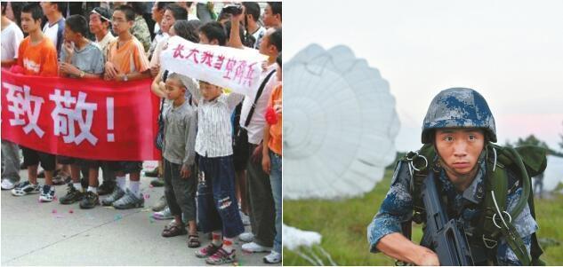 12歲的程強舉起了“長大我當空降兵”的橫幅。