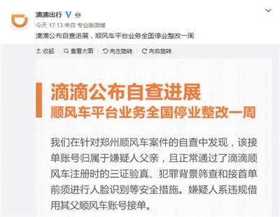 昨日下午,滴滴公司公布鄭州順風車案自查進展,稱順風車平臺業(yè)務全國停業(yè)整改一周。