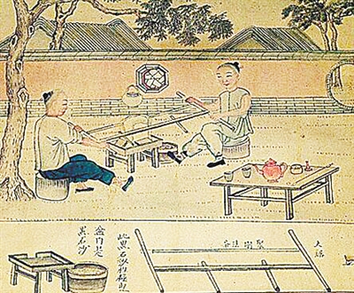 清代李澄淵在光緒十七年(1891年)應(yīng)英國(guó)醫(yī)士畢索普要求畫了一組《玉作圖》。《玉作圖》細(xì)致描繪了從搗沙研漿、開玉、解玉、粗磨、細(xì)磨、掏膛、磨琢紋飾等到最后拋光的各個(gè)制作環(huán)節(jié)的場(chǎng)景。
