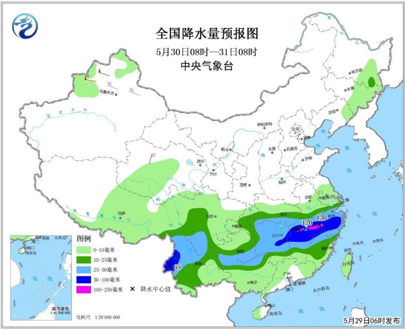 5月30日08時至31日08時,江南大部、江漢南部、華南西北部、西南地區東部和南部、川西高原南部等地有中到大雨,其中江南中北部和云南西部等地的部分地區有暴雨,局地大暴雨(100~130毫米)。上述部分地區有短時強降水、雷暴大風等強對流天氣。新疆北部和青海西北部等地部分地區有4~6級風,北疆山口地區風力可達8~10級。
