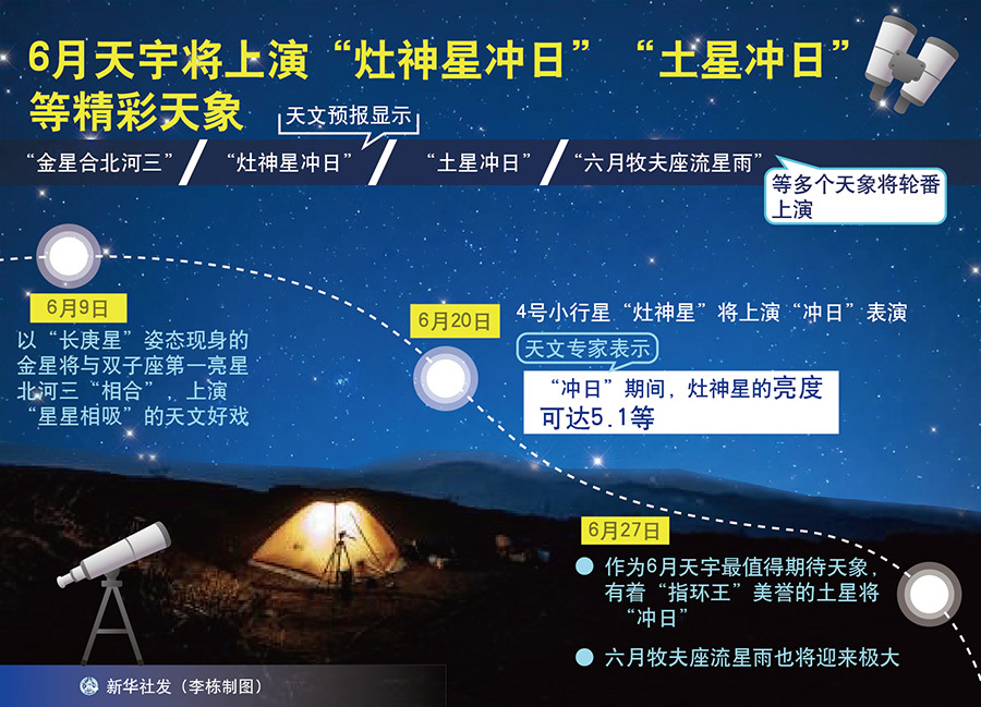 6月夜空,天象精彩。6月9日,以“長庚星”姿態(tài)現(xiàn)身的金星將與雙子座第一亮星北河三“相合”,上演“星星相吸”的天文好戲。此外,4號小行星“灶神星”6月20日將上演“沖日”表演;有著“指環(huán)王”美譽的土星將于6月27日“沖日”;巧合的是,六月牧夫座流星雨也將于27日迎來極大。