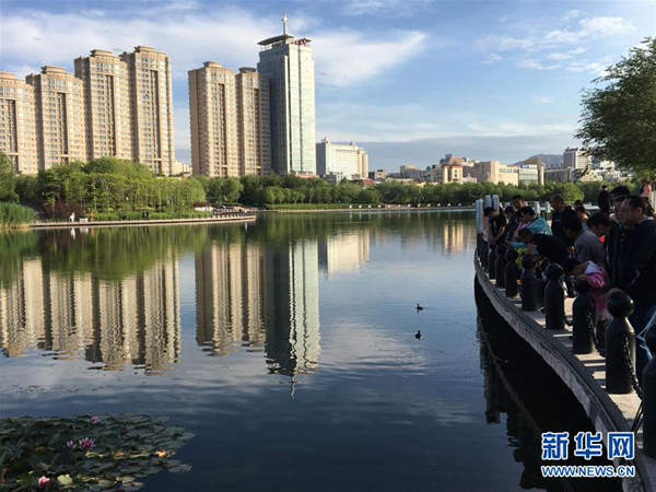 市民在烏魯木齊南湖市民廣場的湖邊欣賞野鴨(6月4日攝)。新華社記者 符曉波 攝