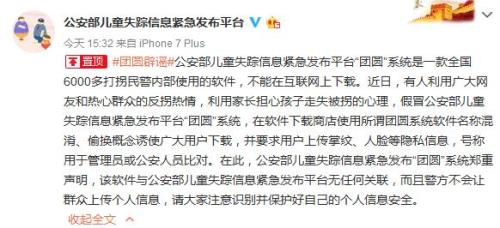 據(jù)公安部兒童失蹤信息緊急發(fā)布平臺官方微博消息,公安部發(fā)布聲明稱,近日有人假冒“團(tuán)圓”系統(tǒng),要求用戶上傳掌紋、人臉等隱私信息,該軟件與公安部兒童失蹤信息緊急發(fā)布平臺無任何關(guān)聯(lián),警方不會讓群眾上傳個人信息。