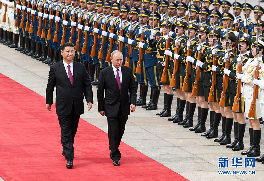 6月8日,國家主席習近平在北京人民大會堂同俄羅斯總統普京舉行會談。這是會談前,習近平在人民大會堂東門外廣場為普京舉行歡迎儀式。新華社記者 陳曄華 攝