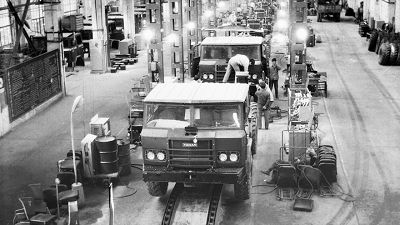 1984年,當年國慶受閱車從陜汽麥李西溝重型軍用汽車基地下線(新華社發);2018年3月15日,卡車從陜重汽汽車總裝配廠下線(新華社記者 邵瑞 攝)。