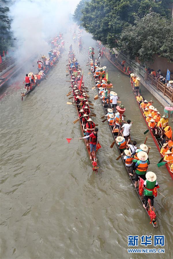 6月14日,多個村的龍舟隊在廣州市天河區(qū)一處河道劃龍舟。當(dāng)日,廣州市天河區(qū)舉行一場熱鬧歡快的龍舟活動,來自多個村莊“走親戚”的龍舟隊參加。按廣州的傳統(tǒng)習(xí)俗,每年農(nóng)歷五月初一至初五,各村的龍舟隊要到周圍村落“走親戚”。走親戚的龍舟隊到來時,受訪村子要準(zhǔn)備好龍舟飯招待來客。活動當(dāng)天,鳴炮敲鑼,一派喜慶氣氛。新華社記者 張加揚 攝