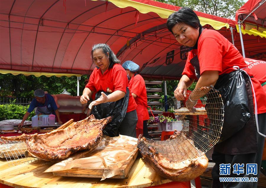 6月14日,工作人員在廣州天河區(qū)珠村七夕廣場準(zhǔn)備龍舟飯。當(dāng)日,廣州市天河區(qū)舉行一場熱鬧歡快的龍舟活動,來自多個村莊“走親戚”的龍舟隊參加。按廣州的傳統(tǒng)習(xí)俗,每年農(nóng)歷五月初一至初五,各村的龍舟隊要到周圍村落“走親戚”。走親戚的龍舟隊到來時,受訪村子要準(zhǔn)備好龍舟飯招待來客。活動當(dāng)天,鳴炮敲鑼,一派喜慶氣氛。新華社記者 鄧華 攝