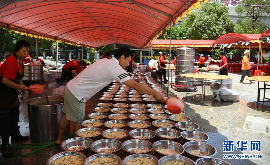 6月14日,工作人員在廣州天河區(qū)珠村七夕廣場準備龍舟飯。當日,廣州市天河區(qū)舉行一場熱鬧歡快的龍舟活動,來自多個村莊“走親戚”的龍舟隊參加。按廣州的傳統(tǒng)習俗,每年農(nóng)歷五月初一至初五,各村的龍舟隊要到周圍村落“走親戚”。走親戚的龍舟隊到來時,受訪村子要準備好龍舟飯招待來客。活動當天,鳴炮敲鑼,一派喜慶氣氛。新華社記者 鄧華 攝