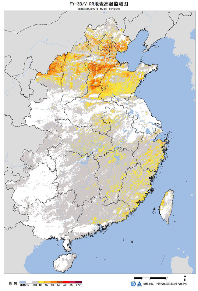 圖1 FY-3B/VIRR氣象衛(wèi)星地表高溫監(jiān)測(cè)圖 2018年6月27日