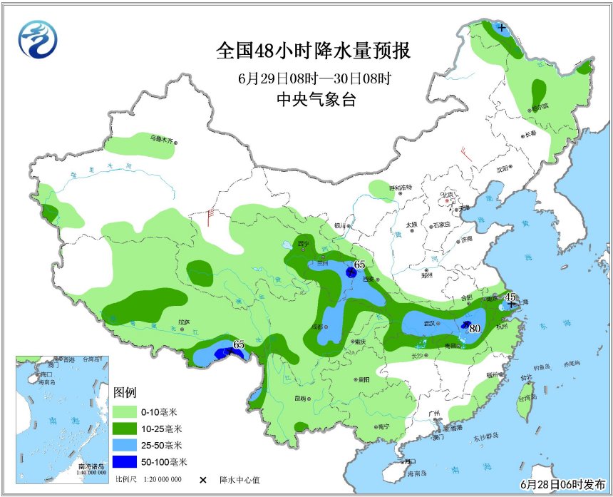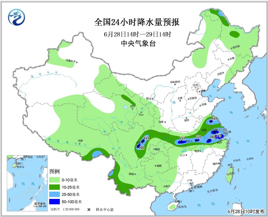 未來,隨著天氣系統(tǒng)的緩慢南壓,主要降水區(qū)還將維持在江淮、江漢、江南北部。6月28日到7月1日,雨帶基本在上述區(qū)域擺動(dòng)。