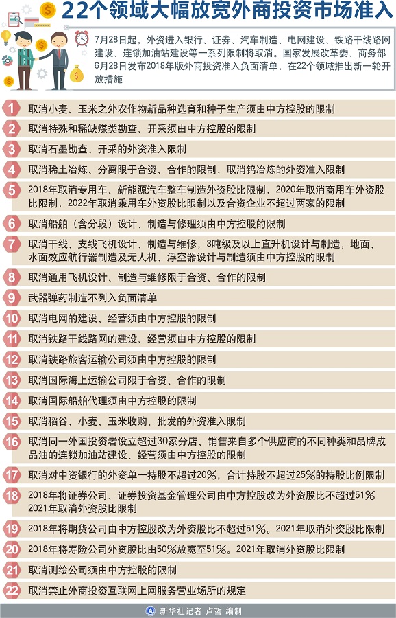 新華社北京6月28日電(記者安蓓、陳煒偉)7月28日起,外資進入銀行、證券、汽車制造、電網建設、鐵路干線路網建設、連鎖加油站建設等一系列限制將取消。國家發展改革委、商務部28日發布2018年版外商投資準入負面清單,在22個領域推出新一輪開放措施。