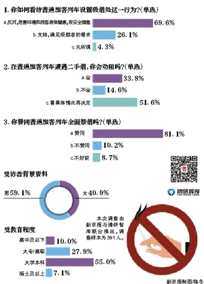 2017年6月,因在普通旅客列車上遭遇二手煙,大學生李華將哈爾濱鐵路局告上法庭,索賠購票款102.5元,同時要求取消有關站臺及該趟列車內的吸煙區、拆除煙具,禁止在上述區域吸煙,并賠償精神損失費人民幣1元等。6月25日下午,北京鐵路運輸法院作出一審判決,要求鐵路局在相關列車上拆除煙具,取消吸煙區。被告人哈鐵局稱,“我國有3億吸煙者,提高服務質量應體現在對上述人群進行疏導而不是全面禁煙”。對此,我們需要關注什么?本期“京報調查”(新京報與清研智庫聯合推出)就此展開調查。