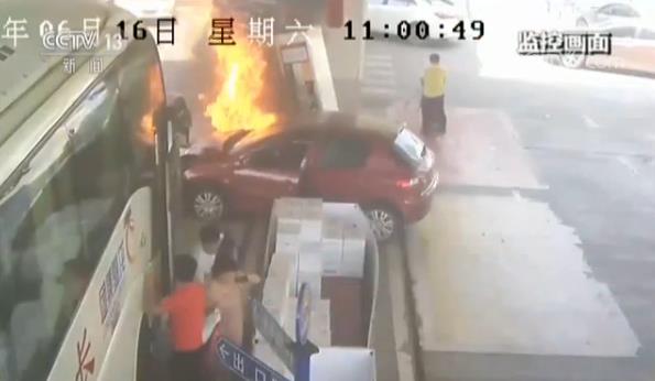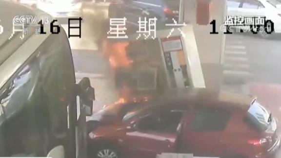 監(jiān)控畫面顯示,6月16日上午11點左右,中石油長沙市岳麓大道加油站內(nèi),一輛紅色轎車突然失控撞倒加油機(jī),隨即引發(fā)大火。