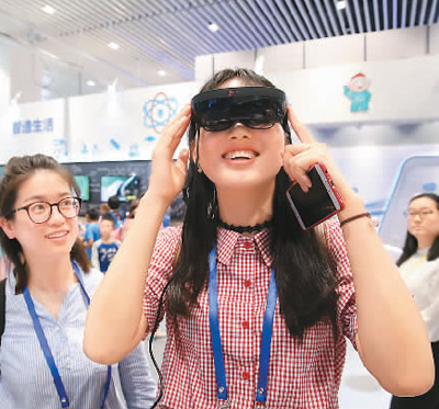 5月19日,參觀者在北京科技周上體驗(yàn)國(guó)際上首款量產(chǎn)版全高清AR智能眼鏡。陳曉根攝(人民視覺(jué))