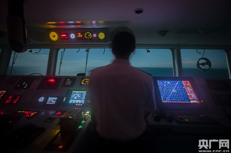“也是為了防范電子設備出現意外嘛。”除了各類儀表的光,駕駛臺里幾乎是漆黑一片。趕在天黑前,三副身后的黑色幕簾被死死拉嚴,沒留一點縫隙。