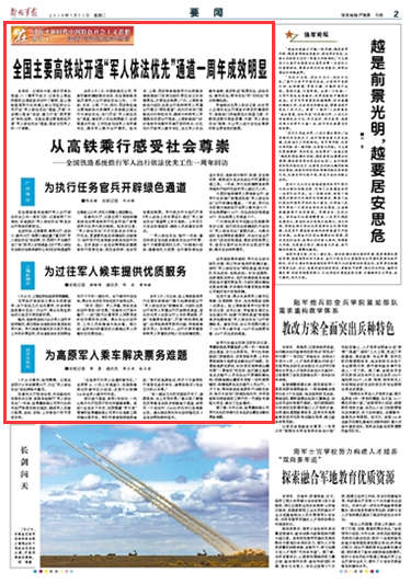 去年8月1日,中國鐵路總公司、軍委后勤保障部聯合決定,在全國鐵路系統(tǒng)開展軍人出行依法優(yōu)先工作。這項政策實施一年來成效如何?記者走進高鐵站進行了采訪調查,實地探訪“軍人依法優(yōu)先”給官兵出行帶來的新變化。請關注今天出版的《解放軍報》的報道——
