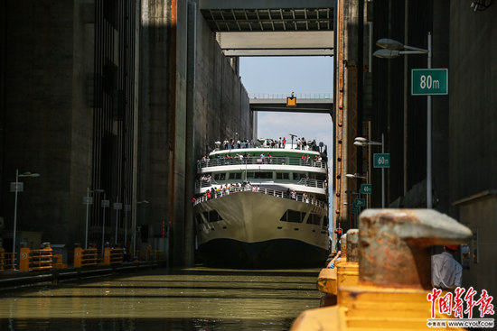 7月31日,湖北省宜昌市,船只準(zhǔn)備進(jìn)入三峽大壩升船機(jī),進(jìn)入廂體后這艘100多米長的客船將乘升船機(jī)下降80多米,“翻越”大壩。三峽升船機(jī)是世界上規(guī)模最大的升船機(jī),也是三峽工程的收官之作。中國青年報·中青在線記者 趙迪/攝