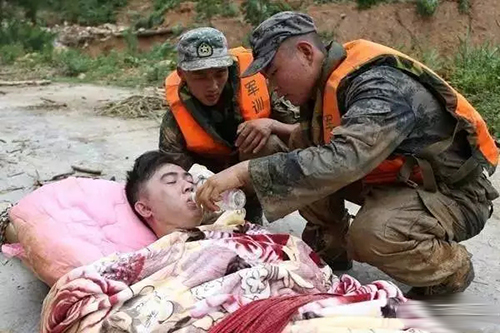 (7)2016年,“莫蘭蒂”臺風后,官兵徒步深入災區,在半米深的泥石流和亂石堆中,抬著受傷人員與死神賽跑。一路八小時,戰士們餓著肚子,把僅有的一瓶礦泉水留給了受傷群眾。有中國軍人的地方,就有依靠。