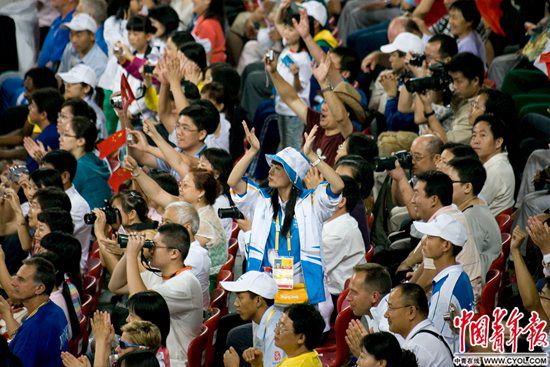 2008年8月21日,國家體育場“鳥巢”,志愿者帶領觀眾為運動員鼓掌。中國青年報·中青在線記者 陳劍/攝