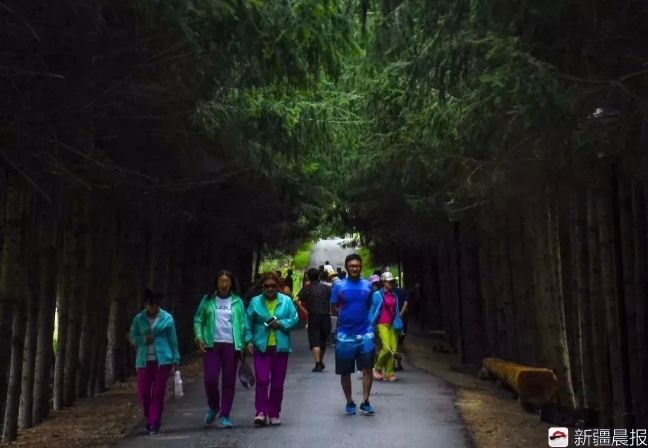 烏蘇佛山國家森林公園待甫僧景區,游客走在綠蔭小道上。圖/新疆經濟報新媒體中心記者 豆興軍