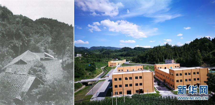 上游務川縣長江村。拼版照片:左圖為20世紀六七十年代的貴州省遵義市務川縣浞水鎮長江村;右圖為貴州省遵義市務川縣浞水鎮長江村新貌(務川縣委宣傳部提供)。新華社發(資料照片)