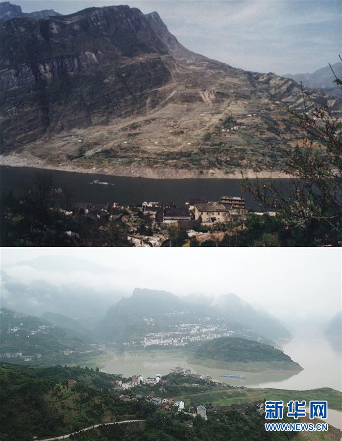 中游秭歸縣長江村。拼版照片:上圖為滑坡后的秭歸縣新灘古鎮(新華社發,資料照片);下圖為7月6日拍攝的湖北省秭歸縣屈原鎮長江村(新華社記者王斯班攝)。新華社發