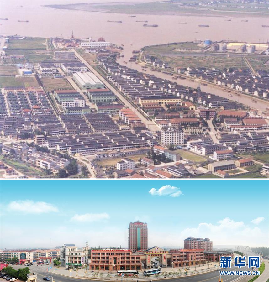 下游張家港市長江村。拼版照片:上圖為20世紀80年代拍攝的江蘇蘇州張家港市長江村;下圖為江蘇蘇州張家港市長江村新貌。新華社發(資料照片)