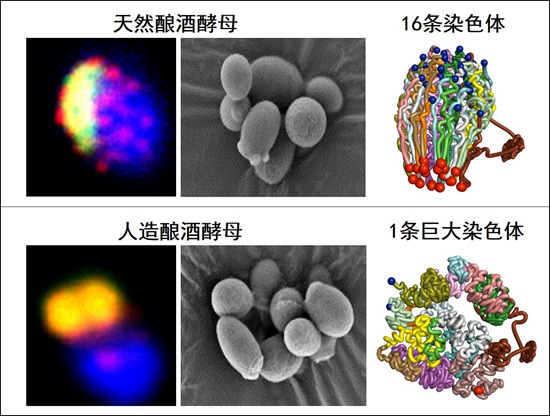 人造單染色體酵母與天然酵母細胞對比圖,兩者形態相似,但染色體的三維結構有巨大改變。中國科學院分子植物科學卓越創新中心/植物生理生態研究所供圖