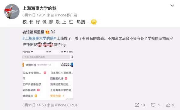 11日,“上海海事大學(xué)的鵝”還在微博上驕傲地說,校長好像都沒有上過熱搜,我們已經(jīng)上了,還配了一張“上海海事大學(xué)的鵝”登熱搜的截圖。