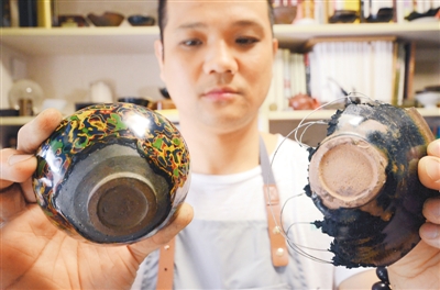 家住江西省南昌市新建區的鋦瓷技藝非遺傳承人熊昊陽展示破損的瓷器經過修復后重放光彩。時 雨攝(人民視覺)