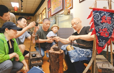 在遼寧省錦州市群眾藝術館非物質文化遺產保護中心,鋦瓷傳承人姜波(右一)在為人們表演鋦瓷。李鐵成攝(人民視覺)